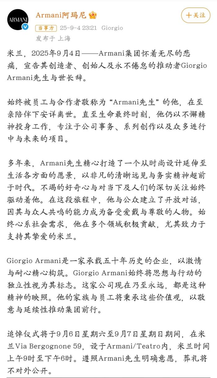 在公告中,阿玛尼表示,“Armani集团怀着无尽的悲痛,宣告其创造者、创始人及永不倦怠的推动者Giorgio Armani先生与世长辞。”