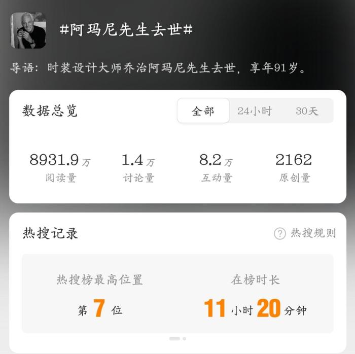 图源:微博热搜有的网友表示感激,“感谢Armani先生曾给予世界美与力量,愿优雅长存。”