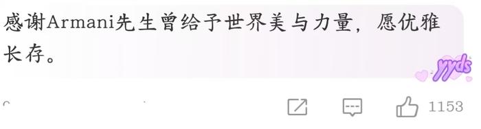 图源:微博评论截图不难看出,大部分网友都对阿玛尼先生的离世感到惊讶和叹息,毕竟,阿玛尼先生确实算是一代时装设计大师,设计了许多新锐服装,甚至掀起过时装界革命。